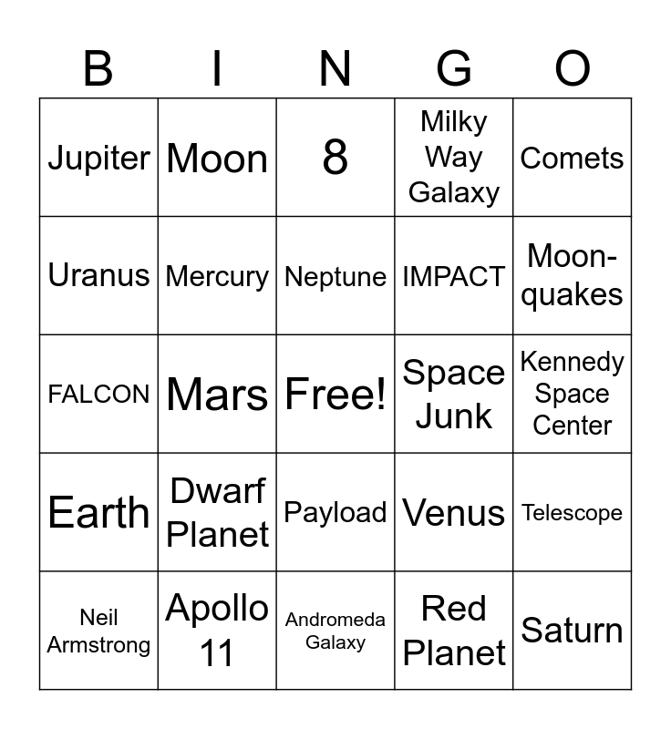 This bingo card has a free space and 26 words: Payload, Red Planet, Neptune, Apollo 11, Comets, Jupiter, Uranus, Moon, Kennedy Space Center, Venus, IMPACT, FALCON, Telescope, Neil Armstrong, Mars, Shrinking, Milky Way Galaxy, Earth, 8, Saturn, Moon-quakes, Andromeda Galaxy, Space Junk, Dwarf Planet, Mercury and Nebula.