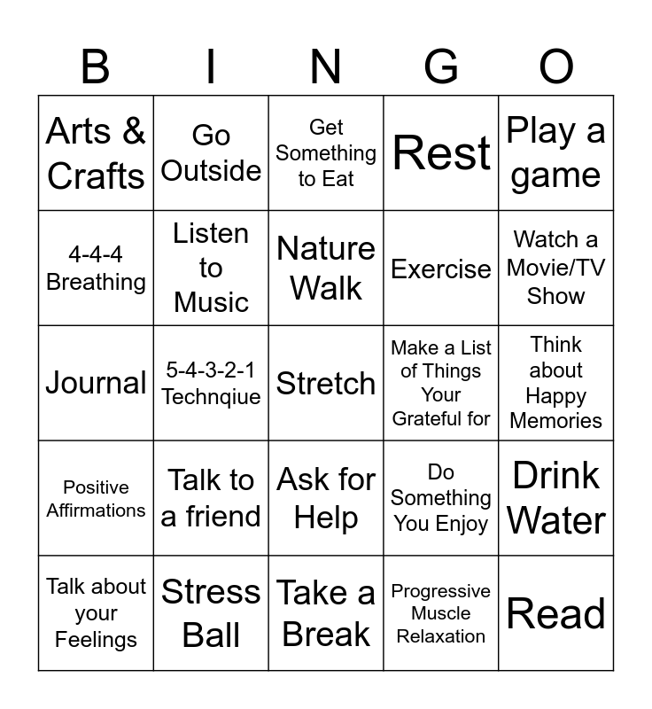 This bingo card has a free space and 24 words: Talk to a friend, Stress Ball, Nature Walk, Talk about your Feelings, Play a game, Arts & Crafts, 4-4-4 Breathing, Go Outside, Make a List of Things Your Grateful for, Ask for Help, Exercise, Journal, Do Something You Enjoy, Drink Water, Listen to Music, Progressive Muscle Relaxation, Think about Happy Memories, Get Something to Eat, Watch a Movie/TV Show, 5-4-3-2-1 Technqiue, Read, Positive Affirmations, Rest and Take a Break.