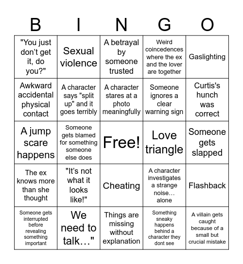 This bingo card has a free space and 24 words: "It’s not what it looks like!", We need to talk…", A character stares at a photo meaningfully, Someone gets interrupted before revealing something important, Gaslighting, "You just don’t get it, do you?", Awkward accidental physical contact, Sexual violence, Love triangle, Cheating, Someone ignores a clear warning sign, A jump scare happens, A character investigates a strange noise… alone, Flashback, A character says "split up" and it goes terribly, Something sneaky happens behind a character they dont see, Someone gets slapped, A betrayal by someone trusted, Curtis's hunch was correct, Someone gets blamed for something someone else does, A villain gets caught because of a small but crucial mistake, The ex knows more than she thought, Weird coincedences where the ex and the lover are together and Things are missing without explanation.