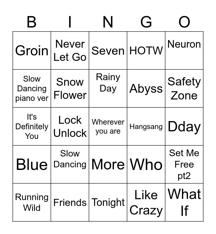This bingo card has a free space and 24 words: Running Wild, Slow Dancing, Rainy Day, Like Crazy, Neuron, Groin, Never Let Go, Seven, Hangsang, Dday, It's Definitely You, Snow Flower, Who, Set Me Free pt2, Slow Dancing piano ver, Friends, Tonight, HOTW, Safety Zone, Blue, Lock Unlock, More, Abyss and What If.