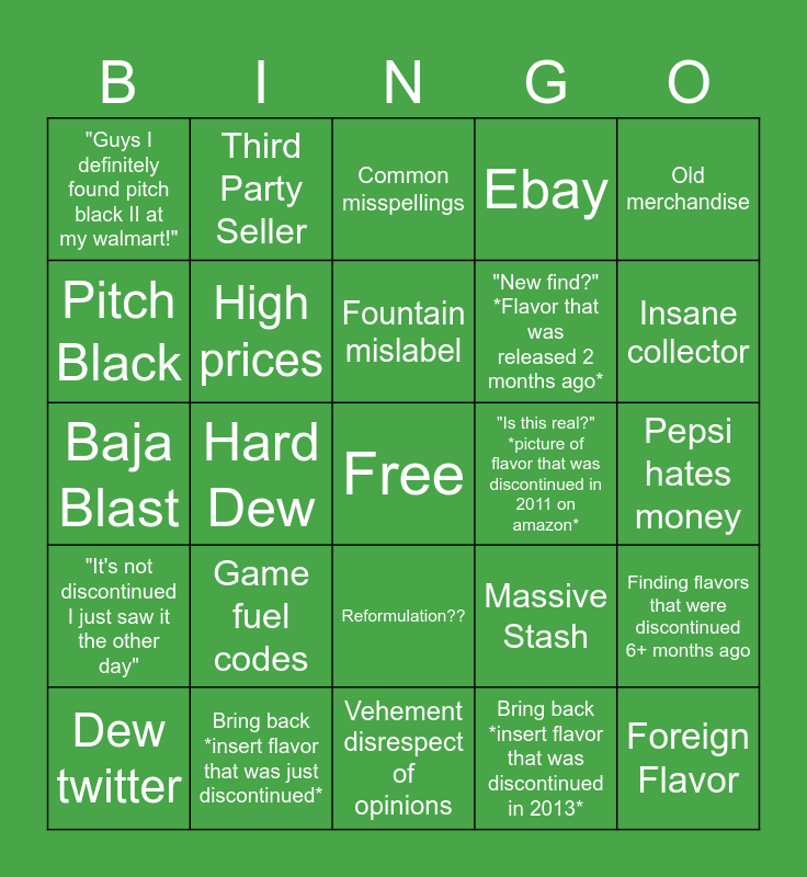 This bingo card has a free space and 24 words: Game fuel codes, Bring back *insert flavor that was just discontinued*, Fountain mislabel, Dew twitter, Old merchandise, "Guys I definitely found pitch black II at my walmart!", Pitch Black, Third Party Seller, "Is this real?" *picture of flavor that was discontinued in 2011 on amazon*, Reformulation??, "New find?" *Flavor that was released 2 months ago*, Baja Blast, Massive Stash, Finding flavors that were discontinued 6+ months ago, High prices, Bring back *insert flavor that was discontinued in 2013*, Pepsi hates money, Common misspellings, Insane collector, Hard Dew, Foreign Flavor, "It's not discontinued I just saw it the other day", Ebay and Vehement disrespect of opinions.