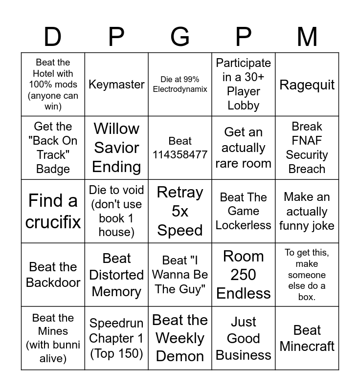 This bingo card has 25 words: Beat the Backdoor, Speedrun Chapter 1 (Top 150), Retray 5x Speed, Just Good Business, Ragequit, Beat the Hotel with 100% mods (anyone can win), Keymaster, Die at 99% Electrodynamix, Beat The Game Lockerless, To get this, make someone else do a box., Get the "Back On Track" Badge, Willow Savior Ending, Beat the Weekly Demon, Room 250 Endless, Break FNAF Security Breach, Beat the Mines (with bunni alive), Die to void (don't use book 1 house), Beat 114358477, Get an actually rare room, Make an actually funny joke, Find a crucifix, Beat Distorted Memory, Beat "I Wanna Be The Guy", Participate in a 30+ Player Lobby and Beat Minecraft.