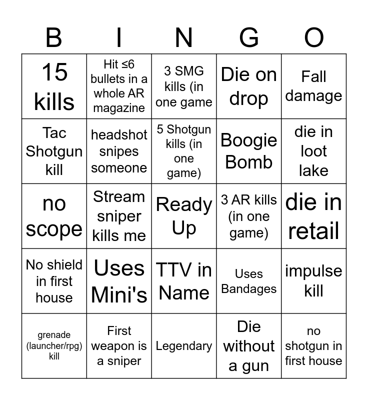 This bingo card has a free space and 58 words: Opponent Survives with <50hp, First weapon is a sniper, gets hit by a trap, No shield in first house, Die without a gun, Die to a sniper, headshot snipes someone, No Launch Pad, Boogie Bomb, Get a Scar, Die on drop, Stream snipers get in the game, gets killed by a skin in the itemshop, Pigpin survives with <50hp, get a win, 15 kills, no shotgun in first house, Fall damage, die in tilted, 5 Shotgun kills (in one game), 3 AR kills (in one game), 3 SMG kills (in one game, grenade (launcher/rpg) kill, impulse kill, die in salty, die in retail, die in greasy, die in fatal feilds, die in loot lake, gets an RPG, 1hp and a dream, Slurp, Burst Rifle kill, double pump kill, gets absolutely beamed, BUSH, kill stream sniper, Stream sniper kills me, no scope, Uses a Med-Kit, Uses Mini's, Uses a Big Pot, Uses Bandages, Kill a Bot, Die to someone who's too patient, Uses an emote after kill, Gets emoted on, TTV in Name, Legendary, Gray weapon kill, Green Weapon kill, Blue weapon kill, Purple weapon kill, Gold weapon kill, Hit ≤6 bullets in a whole AR magazine, Tac SMG kill, Tac Shotgun kill and Late game Chest.