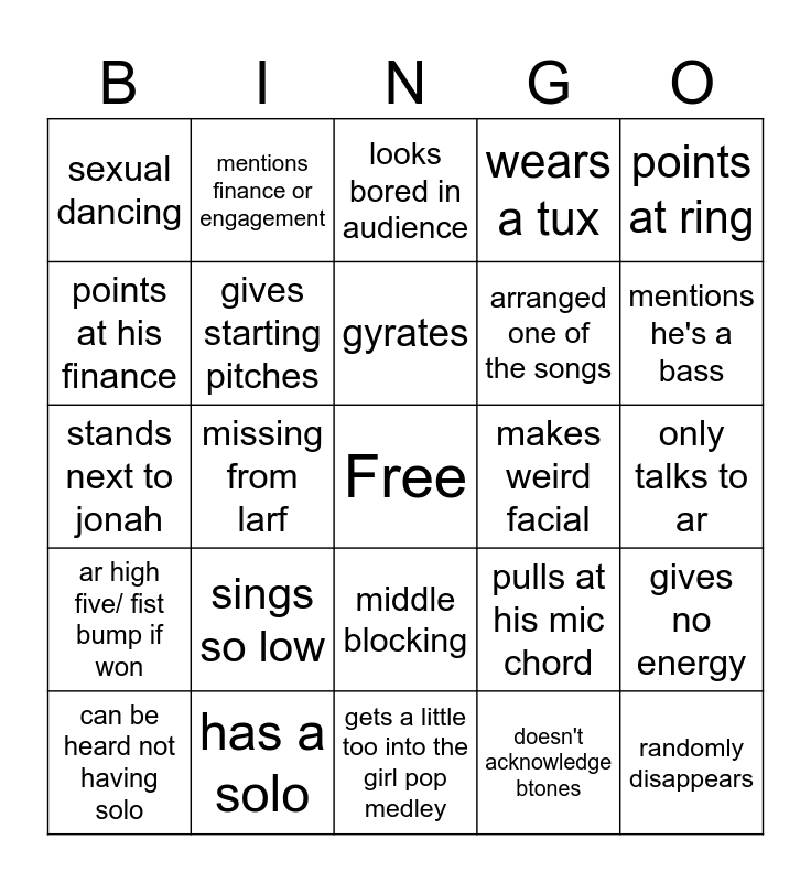 This bingo card has a free space and 24 words: sings so low, has a solo, gyrates, can be heard not having solo, points at ring, sexual dancing, points at his finance, mentions finance or engagement, makes weird facial, middle blocking, arranged one of the songs, stands next to jonah, pulls at his mic chord, gives no energy, gives starting pitches, doesn't acknowledge btones, only talks to ar, looks bored in audience, mentions he's a bass, missing from larf, randomly disappears, ar high five/ fist bump if won, wears a tux and gets a little too into the girl pop medley.