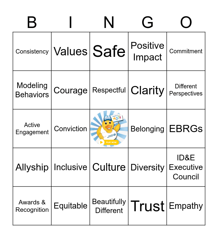 This bingo card has a free space and 24 words: Inclusive, Equitable, Respectful, Awards & Recognition, Commitment, Consistency, Modeling Behaviors, Values, Belonging, Culture, Clarity, Active Engagement, Diversity, ID&E Executive Council, Courage, Trust, EBRGs, Safe, Different Perspectives, Conviction, Empathy, Allyship, Positive Impact and Beautifully Different.