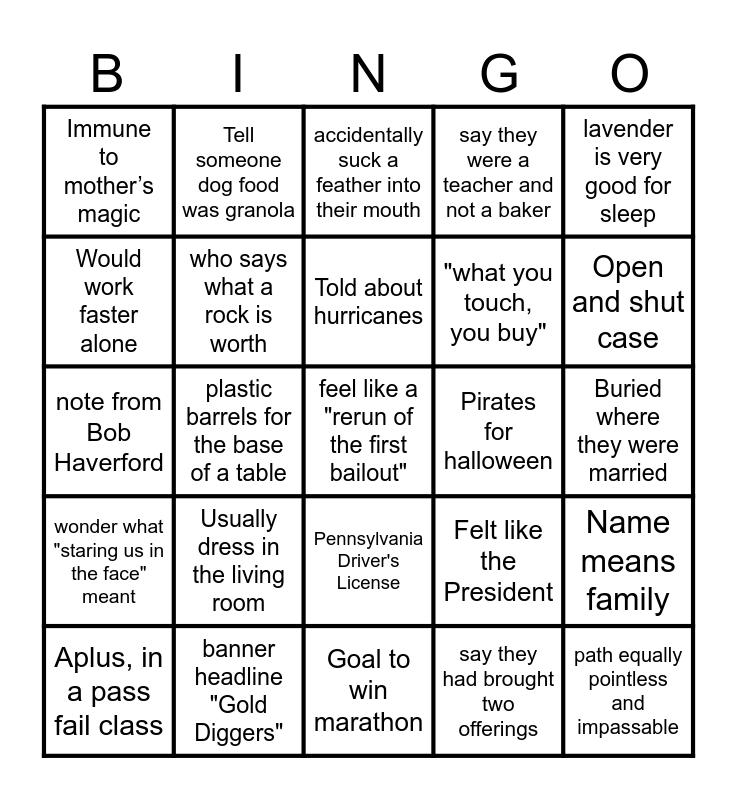 This bingo card has 51 words: Free!, feel like a "rerun of the first bailout", participate in the "main event", Goal to win marathon, Usually dress in the living room, can't wear "confetti paper", Tell someone dog food was granola, Wedding ring missing, Would work faster alone, Wall echo when knocked on, who says what a rock is worth, say they were a teacher and not a baker, Name means family, Felt like the President, even a brave man can't stop a bullet, used to hearing "don't get your hopes up", Told about hurricanes, Pirates for halloween, Puzzle of earth, lavender is very good for sleep, plastic barrels for the base of a table, say they had brought two offerings, Immune to mother’s magic, "what you touch, you buy", eight plus eleven is a lot of years, path equally pointless and impassable, Open and shut case, bright red folder in their backpack, Aplus, in a pass fail class, accidentally suck a feather into their mouth, being recruited for an enriched freshman chemistry class, Real name Beverly, note wasn't a coincidence, “I got a big mouth”, young lawyer Gary Rogers, banner headline "Gold Diggers", Seneca, special vegetarian meals, reading "Murder at Midnight", seem afraid of their husband, Buried where they were married, wonder what "staring us in the face" meant, Old lady is a goner, Frau Pfefferkuchenhaus on their broom, Hug feels like home, washed up has been, note from Bob Haverford, Cadillac was a big car, call a situation "simply atrocious", Pennsylvania Driver's License and think that a car sounded like geese.