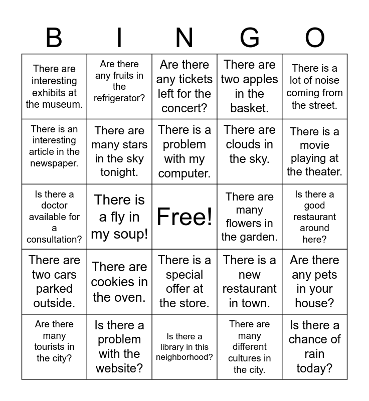 This bingo card has a free space and 36 words: There is a cat on the roof., There are three books on the table., There is a beautiful painting in the living room., There are many stars in the sky tonight., There is a new restaurant in town., There are two cars parked outside., There is a problem with my computer., There are five people in the meeting., There is a lot of noise coming from the street., There are several options to choose from., There is a fly in my soup!, There are two apples in the basket., There is a train arriving at the station., There are many flowers in the garden., There is a movie playing at the theater., There are interesting exhibits at the museum., There is an umbrella in my bag., There are cookies in the oven., Is there a chance of rain today?, Are there any tickets left for the concert?, Is there a good restaurant around here?, Are there any pets in your house?, Is there a problem with the website?, Are there many tourists in the city?, Is there a library in this neighborhood?, Are there any fruits in the refrigerator?, Is there a doctor available for a consultation?, There is a new episode of the show tonight., There are clouds in the sky., There is an interesting article in the newspaper., There are children playing in the park., There is a chance of rain tomorrow., There are many different cultures in the city., There is a special offer at the store., Is there a bank nearby? and Are there any questions about the assignment?.