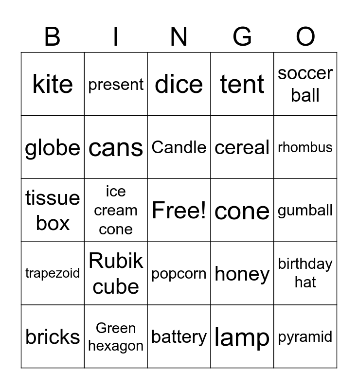 This bingo card has a free space and 24 words: Rubik cube, Green hexagon, Candle, bricks, soccer ball, kite, globe, present, cone, popcorn, cereal, tissue box, honey, birthday hat, cans, lamp, gumball, dice, rhombus, ice cream cone, pyramid, trapezoid, tent and battery.