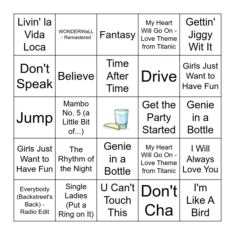 ⚠ This card has duplicate items: No Scrubs (2), Say My Name (2), Fantasy (2), Hot In Herre (2), Thong Song (2), WONDERWaLL - Remastered (2), I Want It That Way (2), ...Baby One More Time (2), I Don't Want to Miss a Thing - From the Touchstone film, Armageddon (2), Wannabe (3), I Will Always Love You (2), Mambo No. 5 (a Little Bit of...) (2), My Heart Will Go On - Love Theme from Titanic (2), Livin' la Vida Loca (2), Bitter Sweet Symphony (2), Don't Speak (2), Waiting for Tonight (2), The Rhythm of the Night (2), Learn to Fly (2), Genie in a Bottle (2), Drive (2), Gettin' Jiggy Wit It (2), Jump (2), Time After Time (2), Believe (2), Africa (2), Save Tonight (2), I Wanna Dance with Somebody (Who Loves Me) (2), Blurred Lines (2), Girls Just Want to Have Fun (2), Single Ladies (Put a Ring on It) (2), U Can't Touch This (2), Kiss from a Rose (2), Everybody (Backstreet's Back) - Radio Edit (2), Get the Party Started (2), Don't Cha (2), Take on Me (2), Torn (2), I'm Like A Bird (2)
