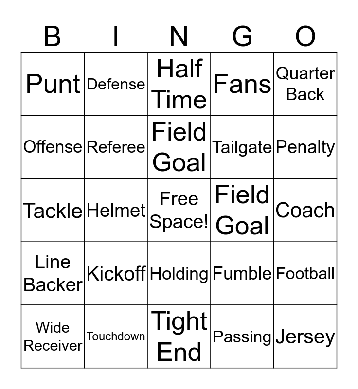 This bingo card has a free space and 24 words: Kickoff, Touchdown, Field Goal, Wide Receiver, Quarter Back, Punt, Offense, Defense, Field Goal, Holding, Tailgate, Tackle, Fumble, Football, Referee, Passing, Coach, Half Time, Penalty, Helmet, Jersey, Line Backer, Fans and Tight End.