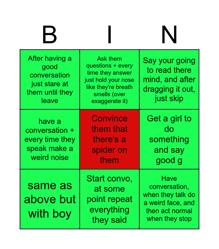 This bingo card has a free space and 8 words: Get a girl to do something and say good g, Say your going to read there mind, and after dragging it out, just skip, Ask them questions + every time they answer just hold your nose like they're breath smells (over exaggerate it), same as above but with boy, After having a good conversation just stare at them until they leave, Have conversation, when they talk do a weird face, and then act normal when they stop, have a conversation + every time they speak make a weird noise and Start convo, at some point repeat everything they said.