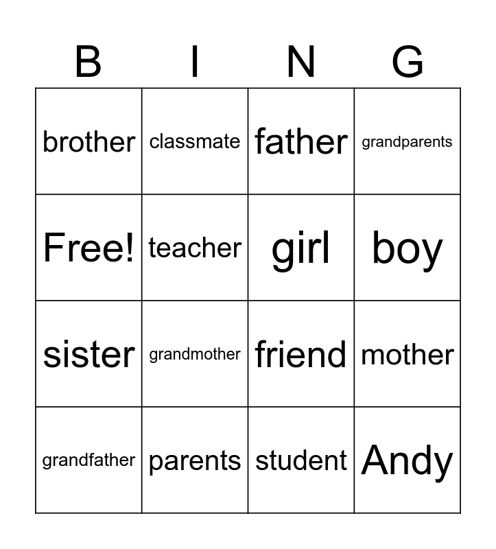 This bingo card has 16 words: parents, mother, father, brother, sister, classmate, friend, student, Free!, teacher, grandfather, grandparents, grandmother, boy, girl and Andy.