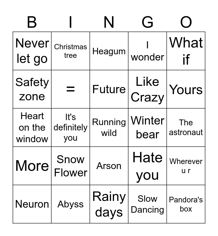 This bingo card has a free space and 24 words: Snow Flower, Abyss, Future, Neuron, What if, Never let go, Safety zone, Christmas tree, Winter bear, Arson, Like Crazy, Heart on the window, Hate you, Wherever u r, =, Slow Dancing, The astronaut, Heagum, Yours, It's definitely you, Pandora's box, More, I wonder and Rainy days.