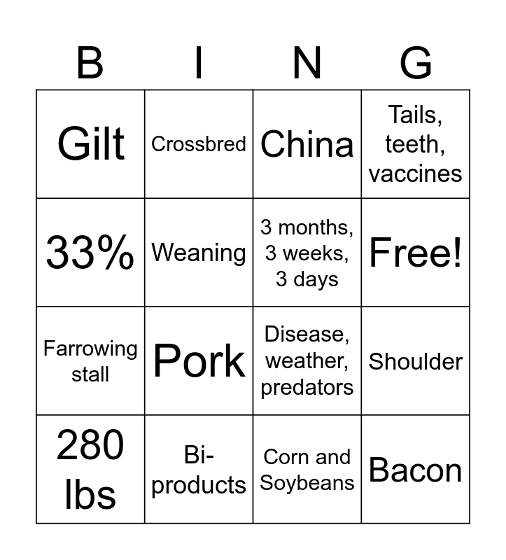 This bingo card has 18 words: Pork, Bacon, China, Gilt, Disease, weather, predators, Tails, teeth, vaccines, 280 lbs, Crossbred, Free!, Farrowing stall, Corn and Soybeans, 33%, Shoulder, Weaning, 3 months, 3 weeks, 3 days, Sweat gland, Bi-products and 35 pounds.