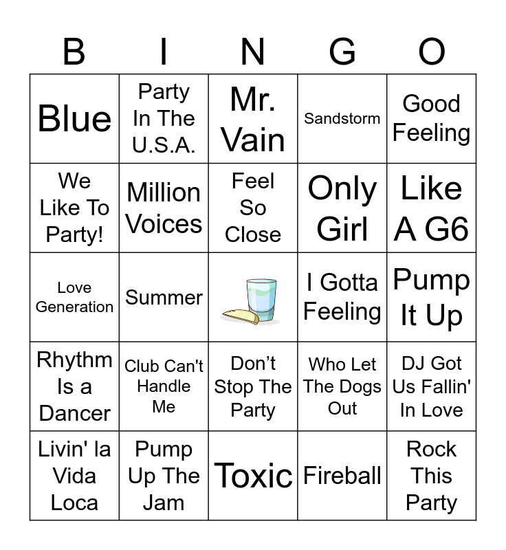This bingo card has a free space and 40 words: One More Time, Love Generation, Memories, Million Voices, Pump Up The Jam, Don’t Stop The Party, Feel So Close, Believe, Good Feeling, Rhythm Is a Dancer, Summer, Sandstorm, Rock This Party, Pump It Up, I Gotta Feeling, Club Can't Handle Me, Better Off Alone, Blue, Scatman, Mr. Vain, DJ Got Us Fallin' In Love, Fireball, Only Girl, We Like To Party!, Gonna Make You Sweat, U Can't Touch This, Ice Ice Baby, Temperature, I'm Too Sexy, The Bad Touch, Turn Down for What, Livin' la Vida Loca, TiK ToK, Who Let The Dogs Out, Like A G6, Toxic, Shots, The Logical Song, Party In The U.S.A. and Harlem Shake.