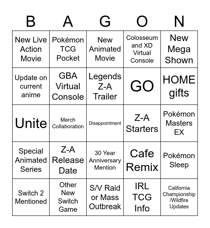 This bingo card has a free space and 24 words: Z-A Release Date, Other New Switch Game, Legends Z-A Trailer, Switch 2 Mentioned, New Mega Shown, New Live Action Movie, Update on current anime, Pokémon TCG Pocket, Z-A Starters, 30 Year Anniversary Mention, GO, Unite, Cafe Remix, Pokémon Sleep, GBA Virtual Console, IRL TCG Info, Pokémon Masters EX, New Animated Movie, HOME gifts, Merch Collaboration, California Championship /Wildfire Updates, Special Animated Series, Colosseum and XD Virtual Console and S/V Raid or Mass Outbreak.