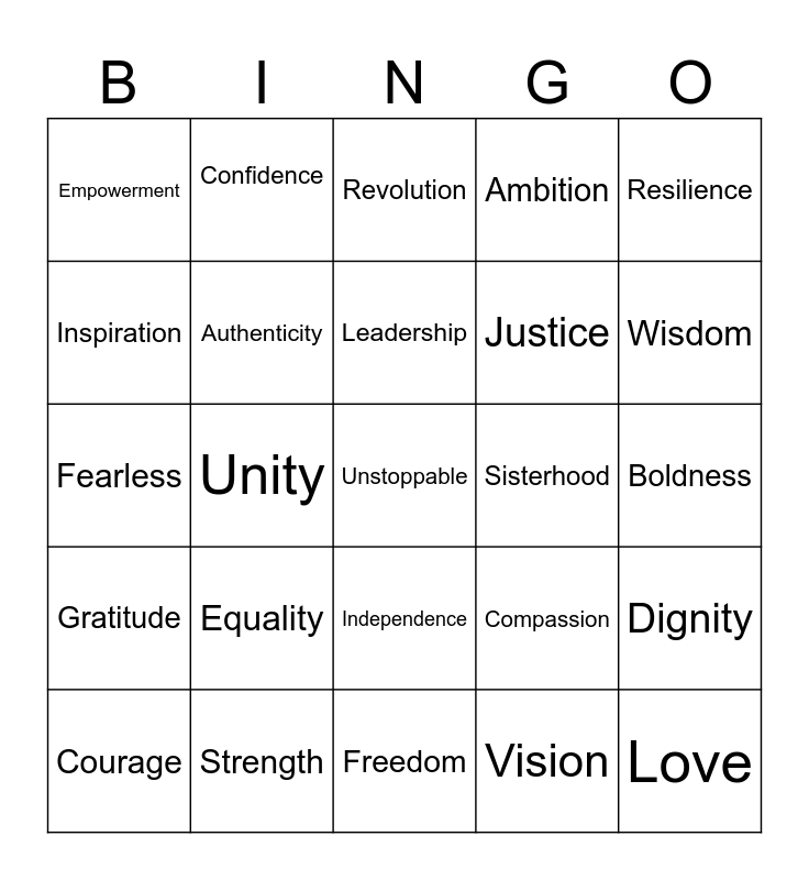 This bingo card has a free space and 24 words: Equality, Strength, Leadership, Courage, Resilience, Empowerment, Inspiration, Confidence, Sisterhood, Independence, Justice, Fearless, Compassion, Dignity, Authenticity, Vision, Boldness, Revolution, Wisdom, Unity, Love, Gratitude, Ambition and Freedom.