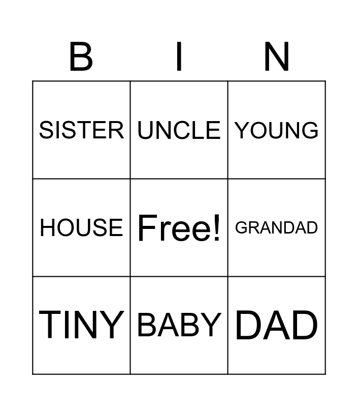 This bingo card has a free space and 19 words: TALL, SHORT, YOUNG, OLD, MUM, DAD, BROTHER, SISTER, UNCLE, AUNTY, GRANDMA, GRANDAD, TINY, SMALL, BIG, NEW, HOUSE, BABY and BEAR.