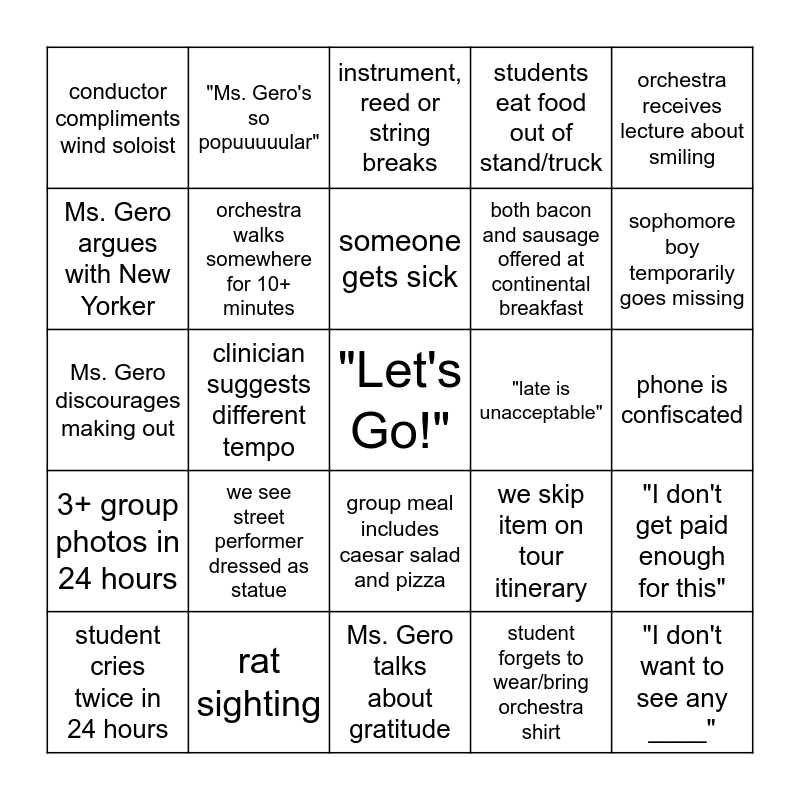 This bingo card has a free space and 39 words: someone falls asleep during show, student posts mid-trip Instagram post about the trip, sophomore falls asleep on the bus, orchestra walks somewhere for 10+ minutes, student cries twice in 24 hours, group meal includes caesar salad and pizza, someone gets sick, Ms. Gero talks about her height, orchestra receives lecture about smiling, 3+ group photos in 24 hours, clinician suggests different tempo, students eat food out of stand/truck, "I don't want to see any ____", phone is confiscated, "late is unacceptable", we see street performer dressed as statue, tour guide asks question about Seattle, conductor compliments wind soloist, Ms. Gero comments on a student's outfit, we skip item on tour itinerary, Ms. Gero argues with New Yorker, Ms. Gero talks about gratitude, both bacon and sausage offered at continental breakfast, sophomore boy temporarily goes missing, we add last-minute item to tour itinerary, wakeup call before 6:50 AM, Remind message includes "a big shoutout to ____", "can you EVEN imagine", we arrive somewhere over 10 minutes late, "Ms. Gero's so popuuuuular", we see pedestrian wearing fur coat, someone sets off metal detector, instrument, reed or string breaks, rat sighting, student forgets to wear/bring orchestra shirt, "Curly and Moe", "I don't get paid enough for this", Ms. Gero discourages making out and "turkeys".