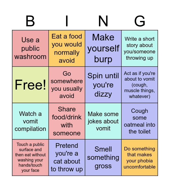 This bingo card has 16 words: Pretend you're a cat about to throw up, Cough some oatmeal into the toilet, Make yourself burp, Use a public washroom, Watch a vomit compilation, Eat a food you would normally avoid, Make some jokes about vomit, Smell something gross, Free!, Go somewhere you usually avoid, Touch a public surface and then eat without washing your hands/touch your face, Write a short story about you/someone throwing up, Share food/drink with someone, Act as if you're about to vomit (cough, muscle things, whatever), Spin until you're dizzy and Do something that makes your phobia uncomfortable.