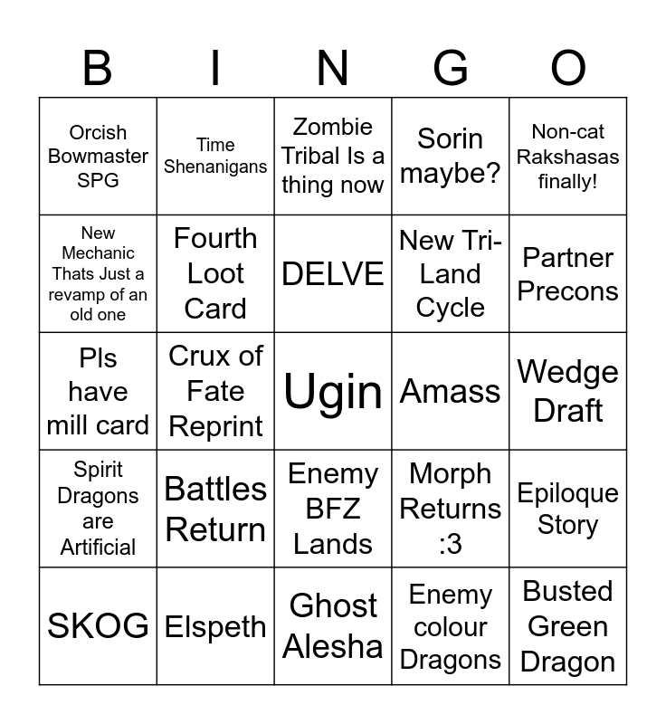 This bingo card has a free space and 24 words: Battles Return, Elspeth, DELVE, SKOG, Non-cat Rakshasas finally!, Orcish Bowmaster SPG, New Mechanic Thats Just a revamp of an old one, Time Shenanigans, Amass, Enemy BFZ Lands, New Tri-Land Cycle, Pls have mill card, Morph Returns :3, Epiloque Story, Fourth Loot Card, Enemy colour Dragons, Wedge Draft, Zombie Tribal Is a thing now, Partner Precons, Crux of Fate Reprint, Busted Green Dragon, Spirit Dragons are Artificial, Sorin maybe? and Ghost Alesha.