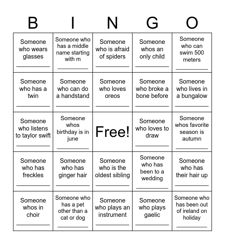 This bingo card has a free space and 30 words: Someone who has a pet other than a cat or dog __________, Someone who speaks more than one language __________, Someone whos birthday is in june __________, Someone who is left handed __________, Someone who wears glasses __________, Someone who is afraid of spiders __________, Someone who can do a handstand __________, Someone who is the oldest sibling __________, Someone who loves to draw __________, Someone who plays an instrument __________, Someone whos favorite season is autumn __________, Someone who has been out of ireland on holiday __________, Someone who plays gaelic __________, Someone who’s favourite colour is yellow __________, Someone who lives in a bungalow __________, Someone who does gymnastics __________, Someone who has been to a wedding __________, Someone who has freckles __________, Someone who has ginger hair __________, Someone who can swim 500 meters __________, Someone who listens to taylor swift __________, Someone who has been to a concert __________, Someone who has a middle name starting with m __________, Someone who broke a bone before __________, Someone who has a twin __________, Someone whos an only child __________, Someone who has their hair up __________, Someone whos in choir __________, Someone who loves oreos __________ and Someone who lives in tyrone __________.