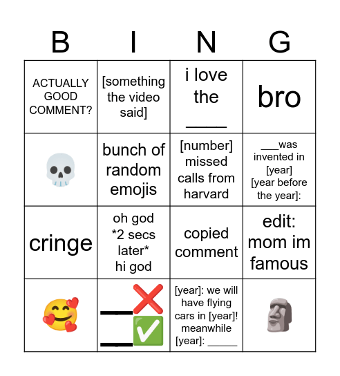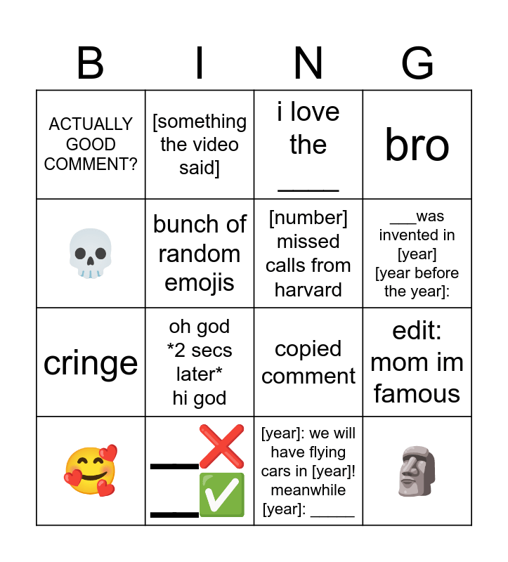 This bingo card has 16 words: __❌ __✅, edit: mom im famous, i love the ____, ACTUALLY GOOD COMMENT?, cringe, [something the video said], copied comment, [year]: we will have flying cars in [year]! meanwhile [year]: _____, 💀, bunch of random emojis, 🥰, bro, oh god *2 secs later* hi god, ___was invented in [year] [year before the year]:, [number] missed calls from harvard and 🗿.