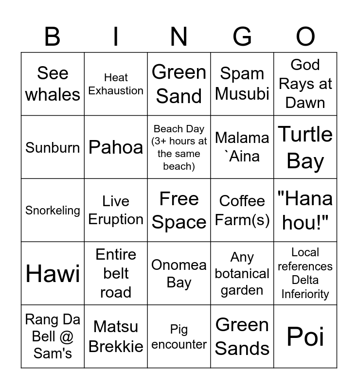 This bingo card has a free space and 30 words: Matsu Brekkie, Volcano, Live Eruption, Slammed 5 or More Tropical Fruits, See whales, Green Sand, Pahoa, Onomea Bay, Coffee Farm(s), Pig encounter, "Hana hou!", Poi, Green Sands, Earthquake!, Turtle Bay, Old Airport, Any botanical garden, Hawi, Entire belt road, God Rays at Dawn, Snorkeling, Tsunami Museum, Heat Exhaustion, Malama `Aina, Sunburn, Spam Musubi, Local references Delta Inferiority, Rang Da Bell @ Sam's, Beach Day (3+ hours at the same beach) and Island Time Disrupts a Plan.