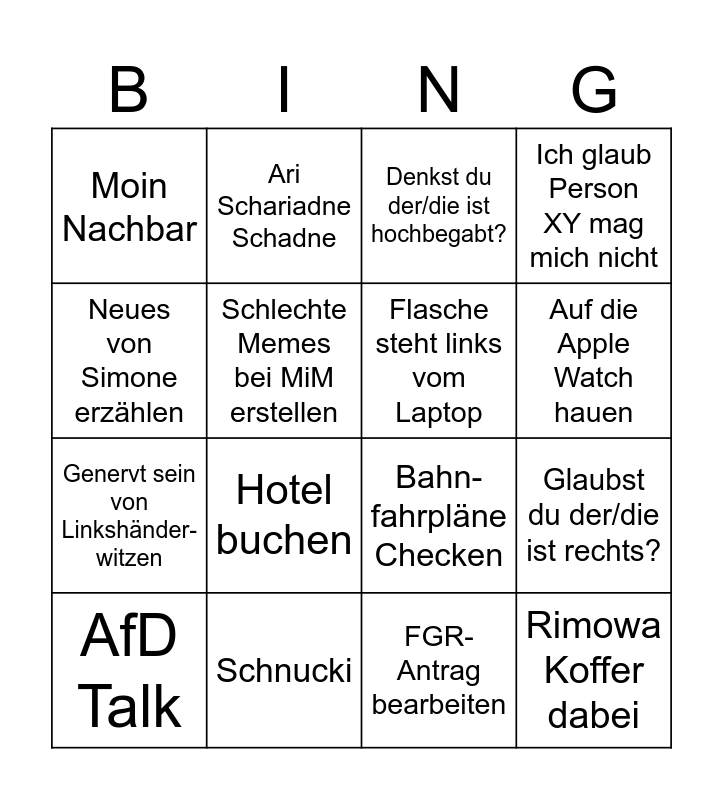 This bingo card has 16 words: Schnucki, Glaubst du der/die ist rechts?, Denkst du der/die ist hochbegabt?, Moin Nachbar, Genervt sein von Linkshänder-witzen, Ari Schariadne Schadne, Bahn-fahrpläne Checken, FGR-Antrag bearbeiten, Neues von Simone erzählen, Schlechte Memes bei MiM erstellen, AfD Talk, Ich glaub Person XY mag mich nicht, Hotel buchen, Auf die Apple Watch hauen, Flasche steht links vom Laptop and Rimowa Koffer dabei.
