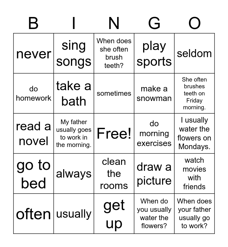This bingo card has a free space and 24 words: always, usually, sometimes, often, seldom, never, do homework, sing songs, do morning exercises, clean the rooms, make a snowman, read a novel, draw a picture, watch movies with friends, take a bath, When do you usually water the flowers?, I usually water the flowers on Mondays., When does she often brush teeth?, She often brushes teeth on Friday morning., My father usually goes to work in the morning., When does your father usually go to work?, go to bed, play sports and get up.