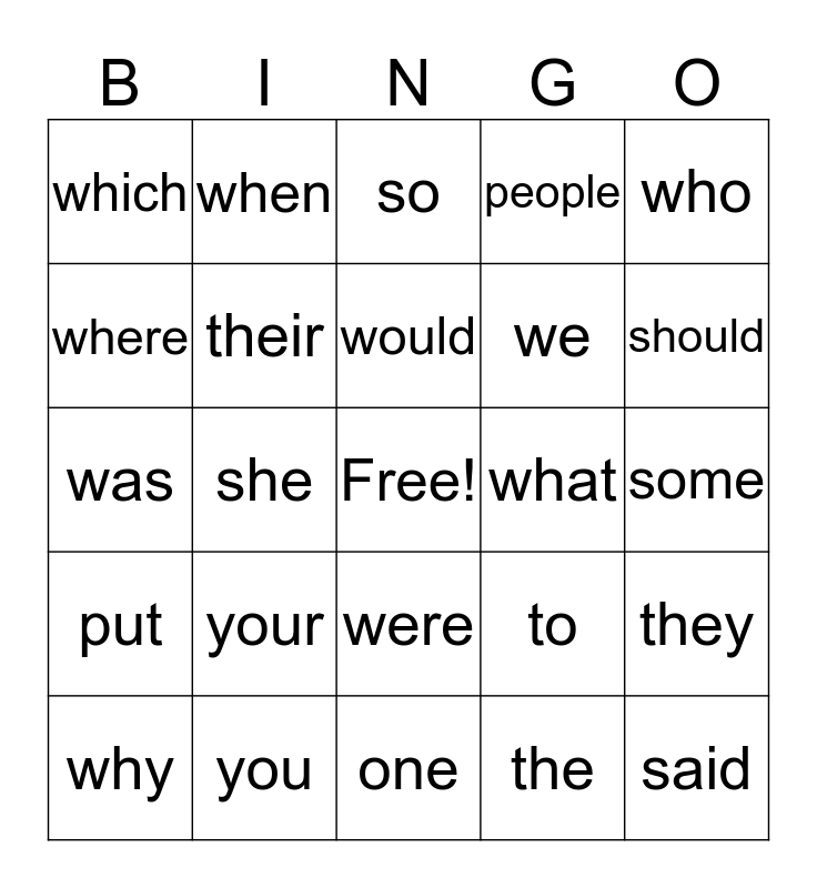This bingo card has a free space and 24 words: your, you, would, why, who, which, where, when, what, were, we, was, to, they, their, the, some, so, should, she, said, put, people and one.