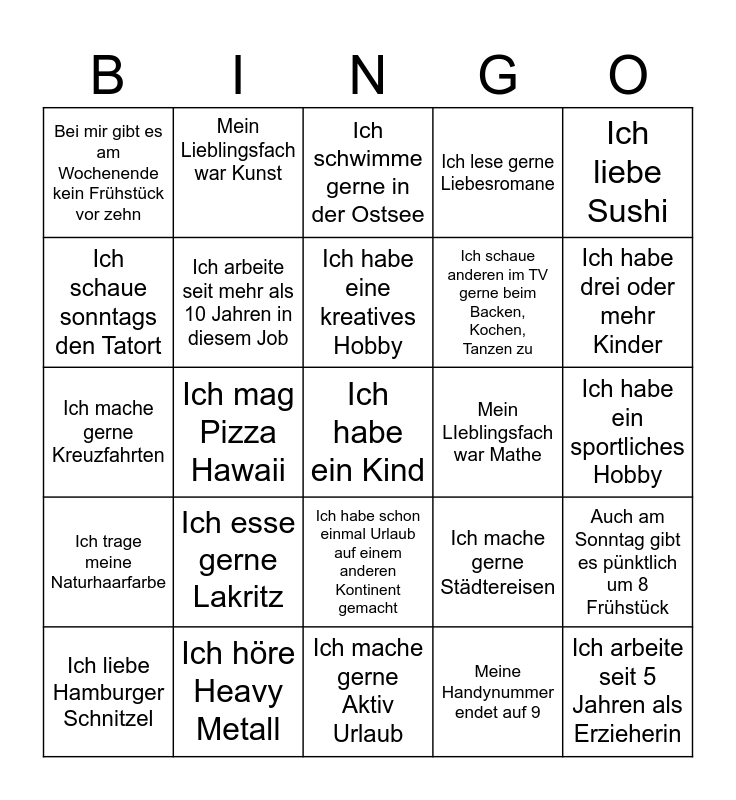 This bingo card has 35 words: Ich habe eine Katze, Ich habe einen Hund, Ich habe zwei Kinder, Ich arbeite seit mehr als 10 Jahren in diesem Job, Ich habe schon einmal Urlaub auf einem anderen Kontinent gemacht, Ich lese gerne Liebesromane, Ich schaue sonntags den Tatort, Ich habe eine Trash TV Sünde, Ich habe eine kreatives Hobby, Ich wurde nicht in Rostock geboren, Ich mache gerne Kreuzfahrten, Ich liebe Sushi, Ich höre gerne Mozart, Ich esse gerne MonCherie, Bei mir gibt es am Wochenende kein Frühstück vor zehn, Mein LIeblingsfach war Mathe, Meine Handynummer endet auf 9, Ich mag Pizza Hawaii, Ich trage meine Naturhaarfarbe, Ich habe ein Kind, Ich mache gerne Städtereisen, Ich liebe Hamburger Schnitzel, Auch am Sonntag gibt es pünktlich um 8 Frühstück, Ich höre Heavy Metall, Ich schwimme gerne in der Ostsee, Ich habe drei oder mehr Kinder, Ich arbeite seit 5 Jahren als Erzieherin, Ich lese gerne Bastei Heftchen, Ich schaue anderen im TV gerne beim Backen, Kochen, Tanzen zu, Ich habe ein sportliches Hobby, Ich liebe All- Inklusive Urlaub, Ich mache gerne Aktiv Urlaub, Ich esse gerne Lakritz, Mein Lieblingsfach war Kunst and Ich trinke gerne Jägermeister.