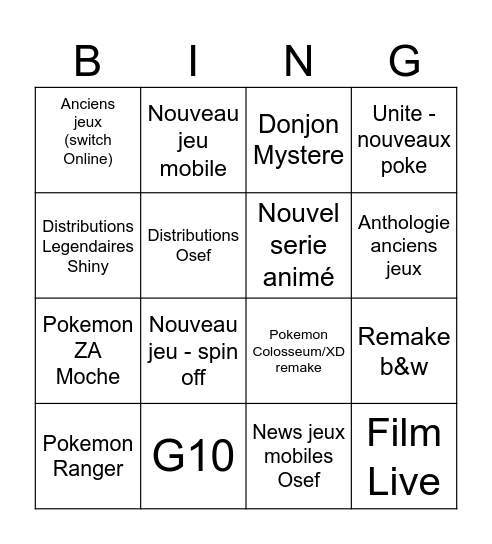 This bingo card has 16 words: G10, Remake b&w, Donjon Mystere, Anciens jeux (switch Online), Pokemon ZA Moche, Nouveau jeu mobile, Pokemon Colosseum/XD remake, News jeux mobiles Osef, Distributions Legendaires Shiny, Distributions Osef, Pokemon Ranger, Unite - nouveaux poke, Nouveau jeu - spin off, Anthologie anciens jeux, Nouvel serie animé and Film Live.