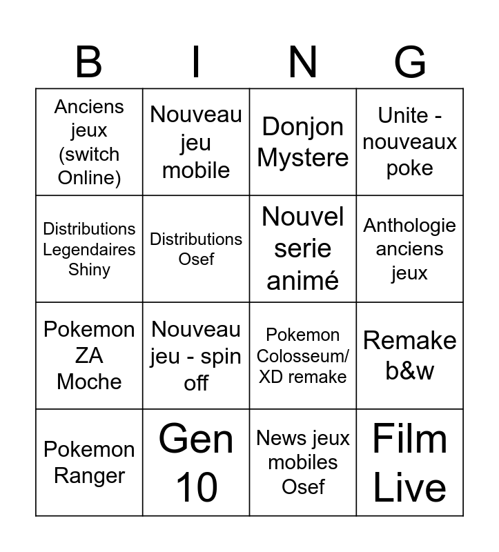 This bingo card has 16 words: Gen 10, Remake b&w, Donjon Mystere, Anciens jeux (switch Online), Pokemon ZA Moche, Nouveau jeu mobile, Pokemon Colosseum/ XD remake, News jeux mobiles Osef, Distributions Legendaires Shiny, Distributions Osef, Pokemon Ranger, Unite - nouveaux poke, Nouveau jeu - spin off, Anthologie anciens jeux, Nouvel serie animé and Film Live.