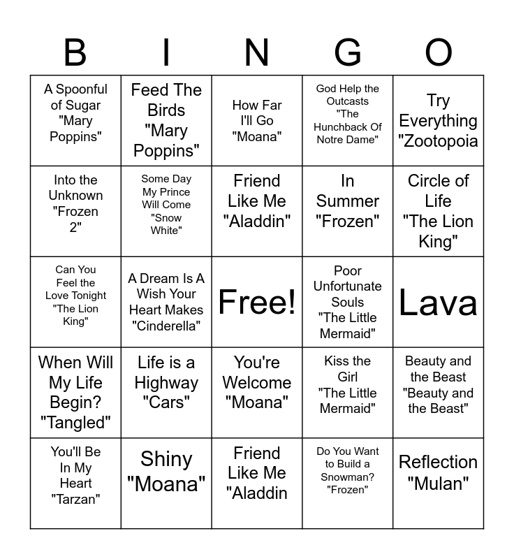 This bingo card has a free space and 29 words: You'll Be In My Heart "Tarzan", That's How You Know "Enchanted", A Dream Is A Wish Your Heart Makes "Cinderella", I Won't Say (I'm In Love) "Hercules", A Spoonful of Sugar "Mary Poppins", How Far I'll Go "Moana", Some Day My Prince Will Come "Snow White", Life is a Highway "Cars", Poor Unfortunate Souls "The Little Mermaid", Shiny "Moana", Lava, Reflection "Mulan", Friend Like Me "Aladdin, Do You Want to Build a Snowman? "Frozen", Circle of Life "The Lion King", Ev'rybody Wants To Be A Cat "The Aristocats", You're Welcome "Moana", When Will My Life Begin? "Tangled", Try Everything "Zootopoia, Can You Feel the Love Tonight "The Lion King", Kiss the Girl "The Little Mermaid", Hakuna Matata "The Lion King", In Summer "Frozen", Into the Unknown "Frozen 2", God Help the Outcasts "The Hunchback Of Notre Dame", Feed The Birds "Mary Poppins", Beauty and the Beast "Beauty and the Beast", Friend Like Me "Aladdin" and Why Should I Worry "Oliver & Company".