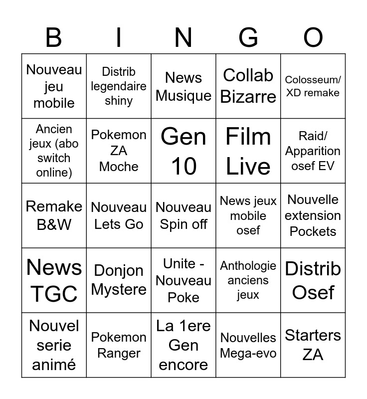 This bingo card has a free space and 24 words: Donjon Mystere, Pokemon Ranger, Gen 10, Nouvel serie animé, Colosseum/ XD remake, Nouveau jeu mobile, Ancien jeux (abo switch online), Distrib legendaire shiny, News jeux mobile osef, Unite - Nouveau Poke, Film Live, Remake B&W, Anthologie anciens jeux, Distrib Osef, Pokemon ZA Moche, Nouvelles Mega-evo, Nouvelle extension Pockets, News Musique, Raid/ Apparition osef EV, Nouveau Lets Go, Starters ZA, News TGC, Collab Bizarre and La 1ere Gen encore.