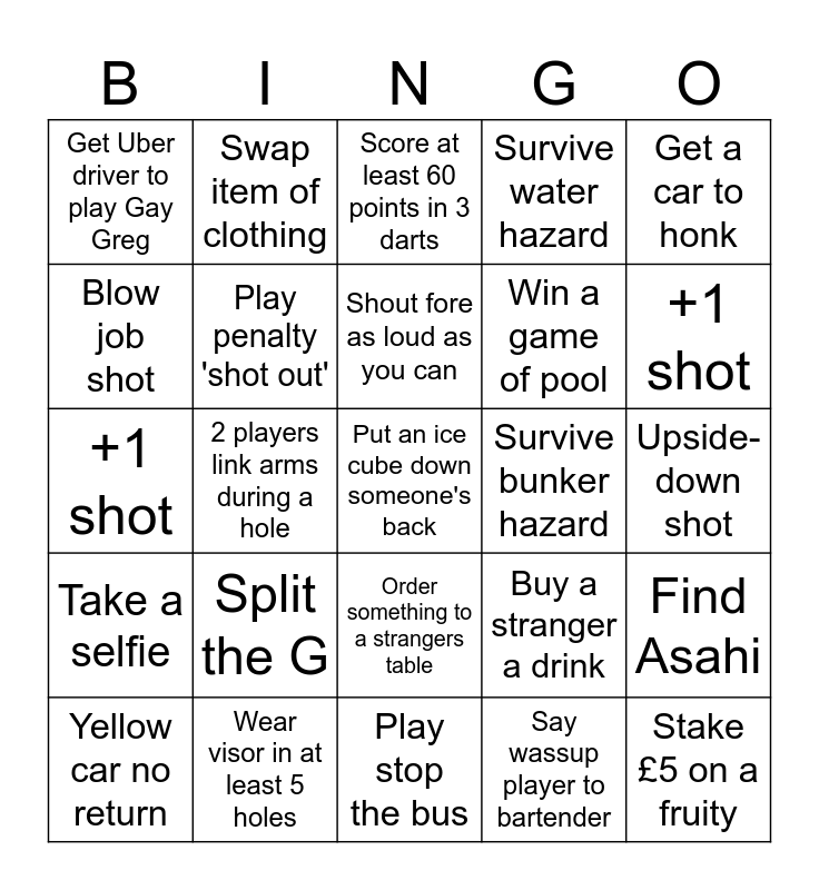 This bingo card has a free space and 24 words: Split the G, Wear visor in at least 5 holes, Shout fore as loud as you can, Yellow car no return, Get a car to honk, Get Uber driver to play Gay Greg, Blow job shot, Swap item of clothing, Survive bunker hazard, Order something to a strangers table, Win a game of pool, +1 shot, Buy a stranger a drink, Find Asahi, Play penalty 'shot out', Say wassup player to bartender, Upside-down shot, Score at least 60 points in 3 darts, +1 shot, 2 players link arms during a hole, Stake £5 on a fruity, Take a selfie, Survive water hazard and Play stop the bus.