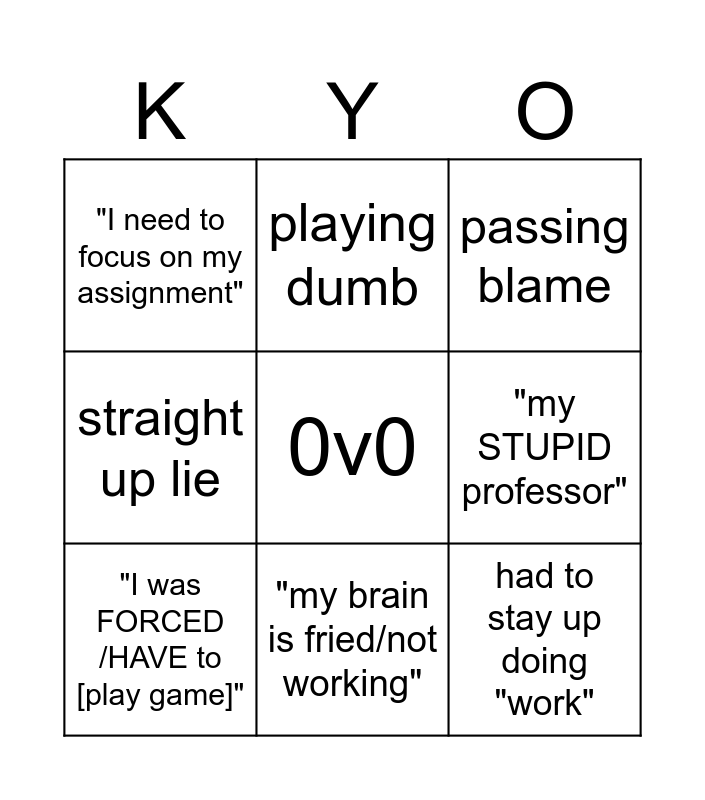 This bingo card has a free space and 8 words: "my STUPID professor", passing blame, playing dumb, "I was FORCED /HAVE to [play game]", "I need to focus on my assignment", had to stay up doing "work", straight up lie and "my brain is fried/not working".