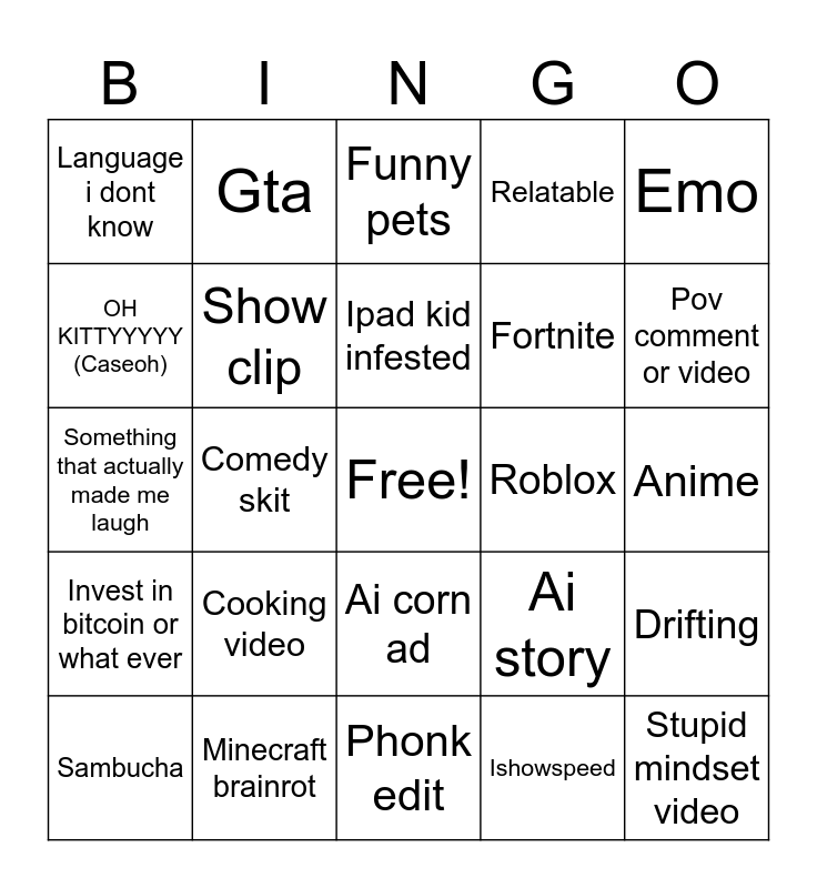 This bingo card has a free space and 24 words: Cooking video, Minecraft brainrot, Ipad kid infested, Sambucha, Emo, Language i dont know, OH KITTYYYYY (Caseoh), Gta, Roblox, Ai corn ad, Fortnite, Something that actually made me laugh, Ai story, Drifting, Show clip, Ishowspeed, Anime, Funny pets, Pov comment or video, Comedy skit, Stupid mindset video, Invest in bitcoin or what ever, Relatable and Phonk edit.