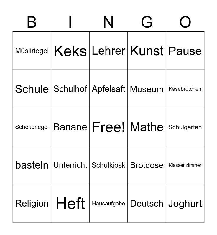 This bingo card has a free space and 24 words: Unterricht, Heft, Apfelsaft, Religion, Pause, Müsliriegel, Schule, Keks, Mathe, Schulkiosk, Museum, Schokoriegel, Brotdose, Klassenzimmer, Schulhof, Deutsch, Schulgarten, Lehrer, Käsebrötchen, Banane, Joghurt, basteln, Kunst and Hausaufgabe.