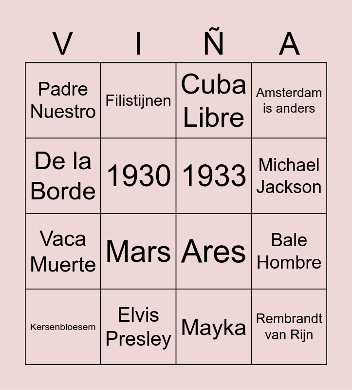 This bingo card has 50 words: 11, Kersenbloesem, 13, Kangoeroe, Eclipse, Filippijnen, Filistijnen, Zweden, 1930, 1799, 1933, Amsterdam is anders, tell me ma, Don't look back in anger, TikTok, Starships, Michael Jackson, Elvis Presley, Azucar, De la Borde, Bale Hombre, Buen Corason, Padre Nuestro, Vaca Muerte, Fuego, De la fortaleza, Mars, Mercurius, Cuba Libre, Budapest, Tsjechie en Italie, Annika, Annika, Reitze, Jannycke, Emma-julia, Hannah, Anna Krol, Mayka, Mayka, Rutger, Isaac Newton, Albert Einstein, Tiber, Donau, Ares, Ludwig van Beethoven, Johann Sebastian Bach, Rembrandt van Rijn and Johannes Vermeer.