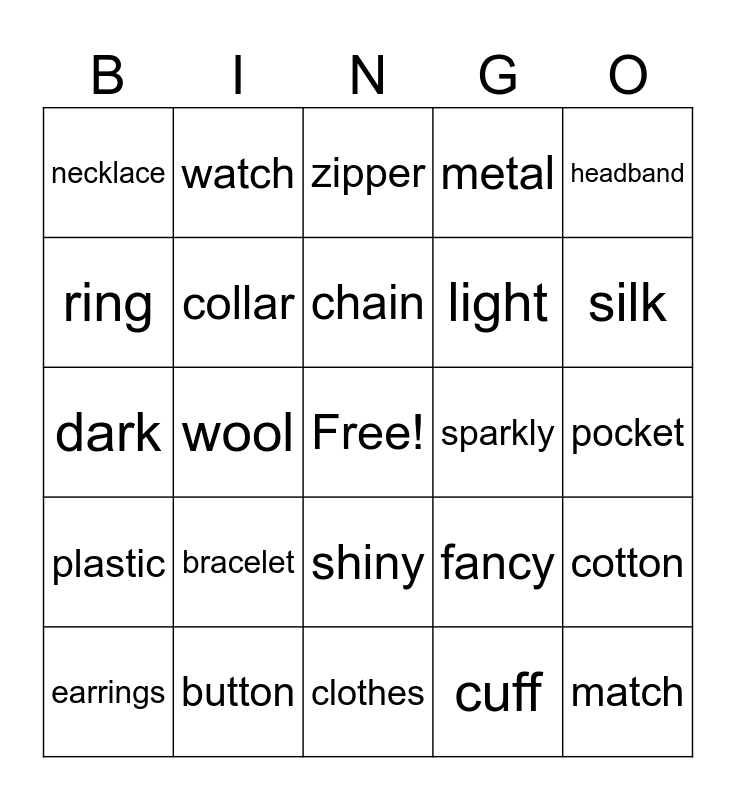 This bingo card has a free space and 24 words: bracelet, button, chain, earrings, headband, necklace, ring, watch, sparkly, shiny, light, dark, fancy, cotton, collar, cuff, pocket, zipper, silk, wool, match, plastic, metal and clothes.