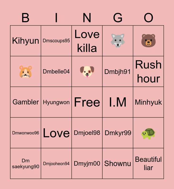 This bingo card has a free space and 24 words: Dm saekyung90, Love, 🐶, Shownu, 🐻, Kihyun, Dmscoups95, Love killa, I.M, Minhyuk, Gambler, Dmbelle04, Dmkyr99, 🐢, 🐹, Dmjooheon94, Dmyjm00, 🐺, Rush hour, Dmwonwoo96, Hyungwon, Dmjoel98, Dmbjh91 and Beautiful liar.