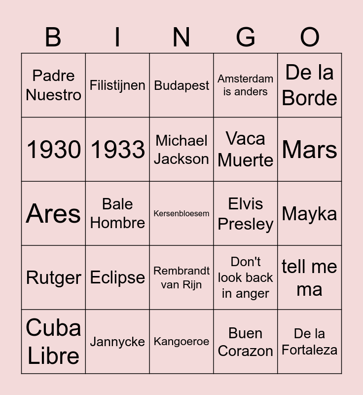 This bingo card has 51 words: 11, Kersenbloesem, 13, Kangoeroe, Eclipse, Filippijnen, Filistijnen, Zweden, 1930, 1799, 1933, Amsterdam is anders, tell me ma, Don't look back in anger, TikTok, Starships, Michael Jackson, Elvis Presley, Azucar, De la Borde, Bale Hombre, Buen Corazon, Padre Nuestro, Vaca Muerte, Fuego, De la Fortaleza, Mars, Mercurius, Cuba Libre, Budapest, Tsjechie, Italie, Annika, Annika, Reitze, Jannycke, Emma-julia, Hannah, Anna Krol, Mayka, Mayka, Rutger, Isaac Newton, Albert Einstein, Tiber, Donau, Ares, Ludwig van Beethoven, Johann Sebastian Bach, Rembrandt van Rijn and Johannes Vermeer.