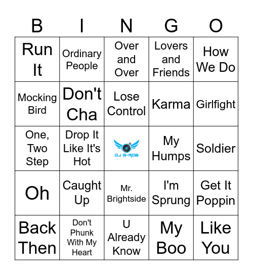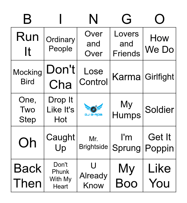 This bingo card has a free space and 40 words: Let Me Love You, One, Two Step, Candy Shop, Don't Cha, Don't Phunk With My Heart, Mr. Brightside, Lose Control, Pon De Replay, How We Do, Oh, Drop It Like It's Hot, Lovers and Friends, Like You, Soldier, My Humps, Caught Up, Feel Good Inc., Run It, Lonely, Over and Over, Get It Poppin, My Boo, Karma, Mocking Bird, 1 Thing, Cater 2 U, It's Like That, Truth Is, Get Back, Daughters, We Be Burnin', Back Then, Wonderful, I'm Sprung, Girlfight, U Already Know, Shake It Off, We Belong Together, Ordinary People and Don't Lie.