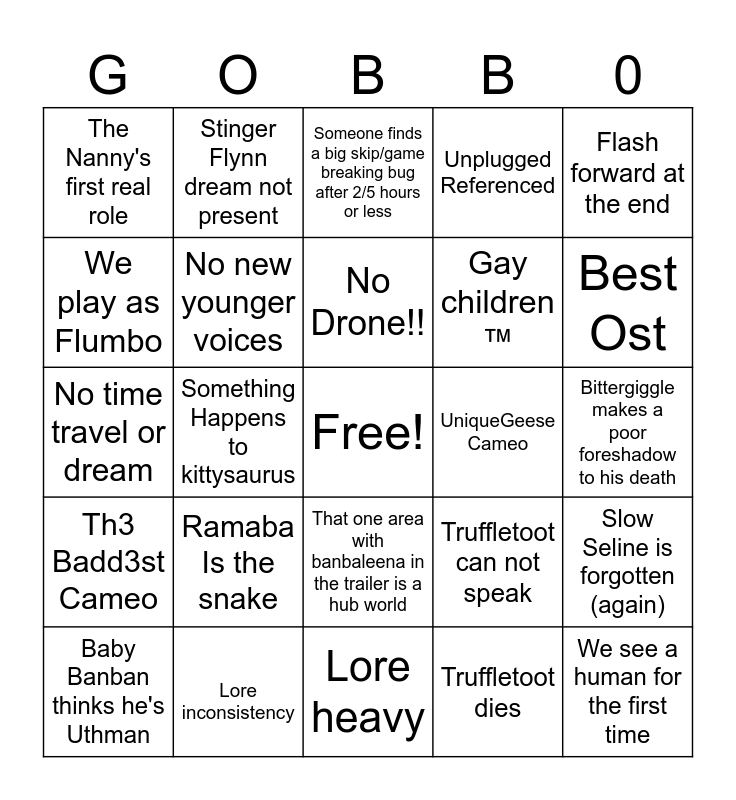 This bingo card has a free space and 24 words: Ramaba Is the snake, Lore inconsistency, No Drone!!, Baby Banban thinks he's Uthman, Flash forward at the end, The Nanny's first real role, We play as Flumbo, Stinger Flynn dream not present, UniqueGeese Cameo, That one area with banbaleena in the trailer is a hub world, Gay children ™, No time travel or dream, Truffletoot can not speak, Slow Seline is forgotten (again), No new younger voices, Truffletoot dies, Bittergiggle makes a poor foreshadow to his death, Someone finds a big skip/game breaking bug after 2/5 hours or less, Best Ost, Something Happens to kittysaurus, We see a human for the first time, Th3 Badd3st Cameo, Unplugged Referenced and Lore heavy.