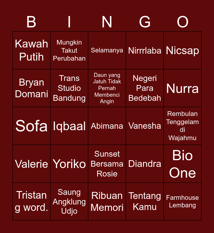 This bingo card has 25 words: Yoriko, Ribuan Memori, Daun yang Jatuh Tidak Pernah Membenci Angin, Tristan g word., Nicsap, Kawah Putih, Bryan Domani, Mungkin Takut Perubahan, Vanesha, Sunset Bersama Rosie, Negeri Para Bedebah, Sofa, Diandra, Bio One, Trans Studio Bandung, Farmhouse Lembang, Rembulan Tenggelam di Wajahmu, Selamanya, Nurra, Iqbaal, Abimana, Saung Angklung Udjo, Valerie, Nirrrlaba and Tentang Kamu.