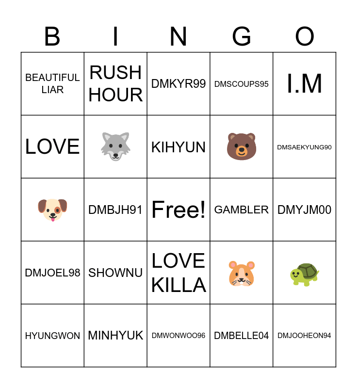 This bingo card has a free space and 24 words: SHOWNU, MINHYUK, KIHYUN, HYUNGWON, I.M, BEAUTIFUL LIAR, LOVE, RUSH HOUR, GAMBLER, LOVE KILLA, 🐻, 🐶, 🐹, 🐢, 🐺, DMBELLE04, DMYJM00, DMKYR99, DMSAEKYUNG90, DMBJH91, DMJOOHEON94, DMJOEL98, DMSCOUPS95 and DMWONWOO96.