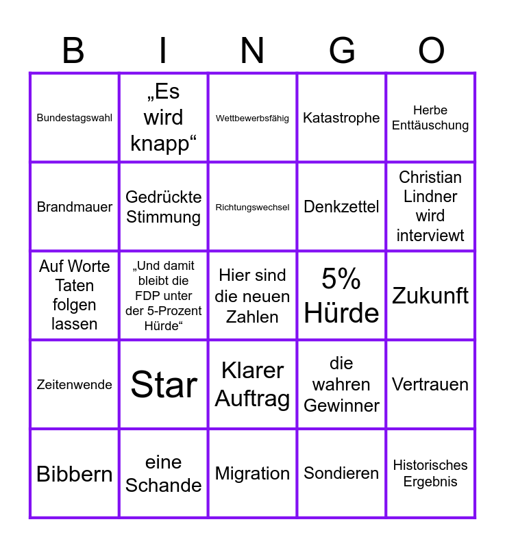 This bingo card has 45 words: Warm anziehen, Hier sind die neuen Zahlen, Feiern, Bibbern, Die Hand reichen, Sondieren, Wettbewerbsfähig, Freude, Herbe Enttäuschung, eine Schande, Katastrophe, 5% Hürde, Klarer Auftrag, Star, Abwärtsspirale, Migration, Nach vorne schauen, Auf Worte Taten folgen lassen, Angela Merkel wird gezeigt, Christian Lindner wird interviewt, „Es wird knapp“, Verhandlungen, K-Frage, Bundestagswahl, Soziale Medien, Zukunft, Regierungskrise, Public Screaming, die wahren Gewinner, Zeitenwende, Erstmal in die Analyse gehen, Vertrauen, Ampel-Aus, Ärmel hochkrempeln, Zuversicht (gesagt von Habeck), „Und damit bleibt die FDP unter der 5-Prozent Hürde“, „Es bleibt spannend.“, Schock, Historisches Ergebnis, Richtungswechsel, Brandmauer, Denkzettel, Stabilität, Gedrückte Stimmung and Touch-Screen funktioniert nicht.
