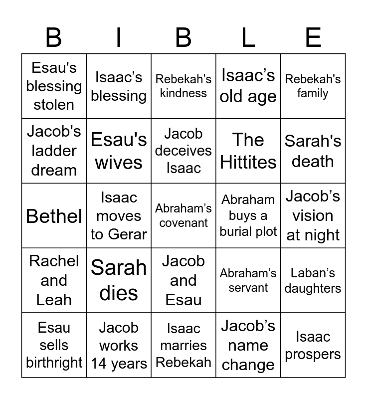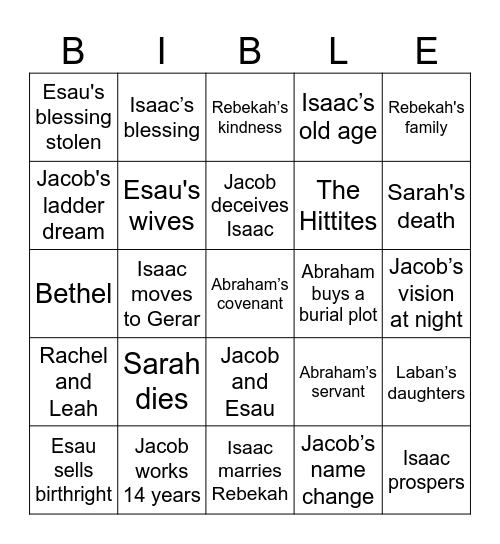 This bingo card has 25 words: Sarah dies, Isaac marries Rebekah, Jacob deceives Isaac, Esau sells birthright, Rebekah's family, Esau's blessing stolen, Jacob's ladder dream, Isaac’s blessing, Abraham buys a burial plot, Jacob and Esau, The Hittites, Bethel, Abraham’s servant, Laban’s daughters, Esau's wives, Isaac prospers, Jacob’s vision at night, Rebekah’s kindness, Sarah's death, Isaac moves to Gerar, Abraham’s covenant, Jacob works 14 years, Rachel and Leah, Isaac’s old age and Jacob’s name change.